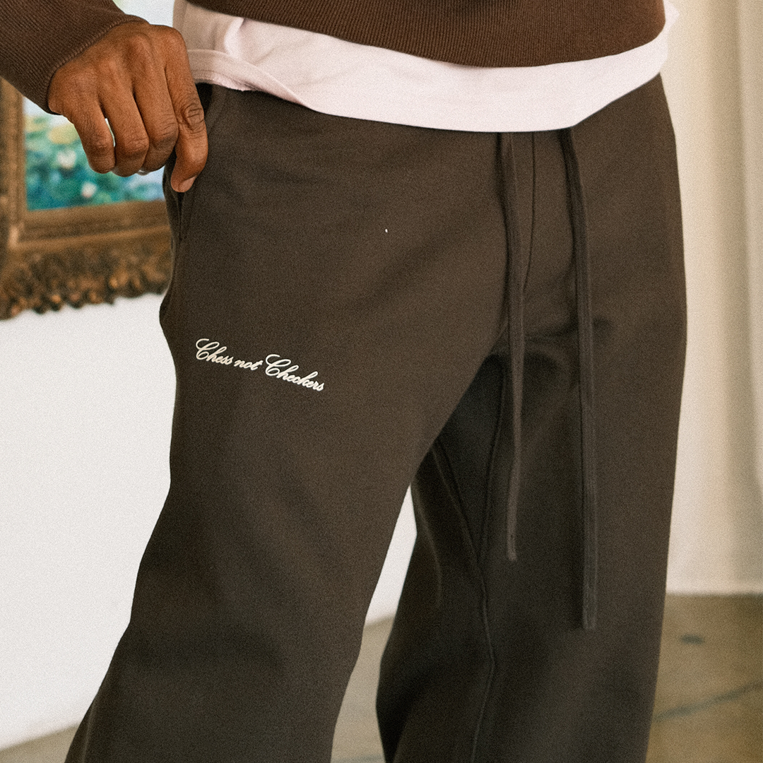 Introducing the latest addition to our collection: the "Staple" straight leg joggers. Redefining style and form in our catalog, these joggers feature a sleek "Chess not Checkers" logo screen-printed on the front right pocket. A must-have in every wardrobe, these joggers are set to become your essential choice.